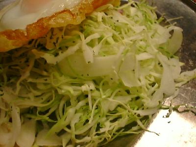 要するに、ソーセージを焼いたものと目玉焼きに、スパゲッティが少々とキャベツの千切りがついたものです。