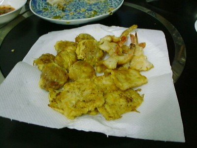 - これも、やっぱりチジミのタレで食べてねと言われました。 3種類で白身魚、ひきにく、それから海老。3種の中ではひきにくが好きかな。(い)