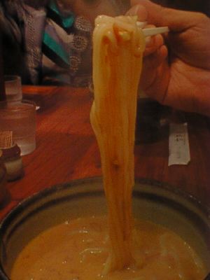 うどんは細麺で、つるっとしている。湯で時間の問題なのか、コシがなかった。カレーは、牛乳がたっぷりはいっていて、マイルドになっている。ゴマとかネギをお好みで入れるのだが、ネギがお勧め。しかしながら全体的に、これがというような特徴は感じることは出来ない。これだと、むしろ普通のうどんのほうに興味を感じる。(な)