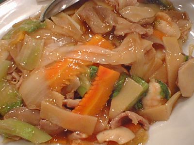 これ、美味しいです。まさにエビ(しっぽの皮もとってある)の天ぷらに唐辛子とネギのソースをかけたものだけど、エビもいいし(ちゃんと人数分×2で出してくれた)、ソースの味がグー。香菜の香りもこの料理に合ってます。(め)