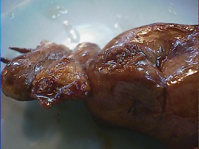 - 血きもとはレバーのことですね。この大きさを見てください!とろーりとして、すごく新鮮なレバー。こんなうまいレバーは初めて食べました。注意深い読者はすでにお気づきのことと思いますが、この店の焼き鳥はほとんど塩だけど、これだけがタレです。(この後の写真で皿についてるタレは血きもから落ちたタレ)どうやらウナギに使うタレらしく甘めのタレだけど、なかなかよいです。