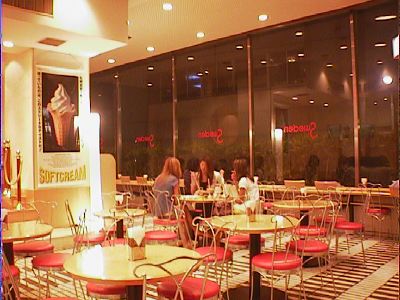 ここは以前に「スウェンセンズ」というアイスクリーム屋さんだったところで、何年か前、頭がぐらぐら来るほど甘いキャラメルソースのかかったパフェを食べたことのある店です。スウェーデンとスウェンセンズの関係はよくわからないけど、ちょっと名前が似てる気がします。ここのソフトクリームはなかなか美味しいし、広くて落ち着けていいです。でも、店がかわってしまうと、もう2度と食べたくないと思ったあの殺人的に甘いパフェがなんとなく懐かしく思えます。(め)