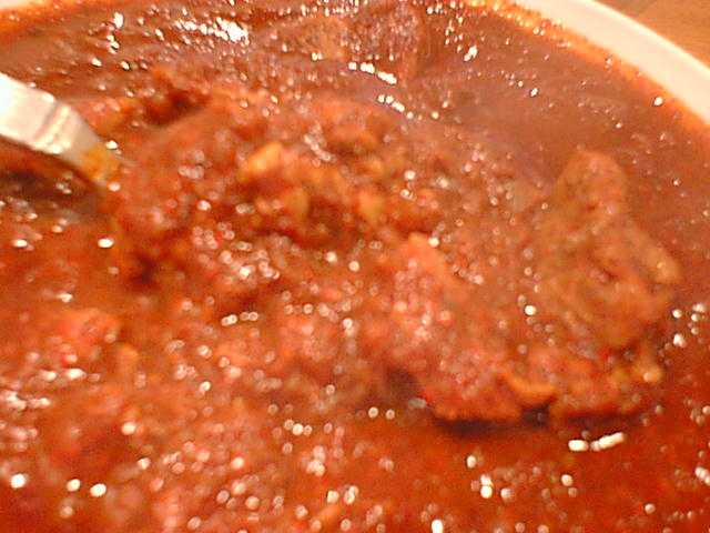 - こっち(ホット)はかろうじてカレーの形を保っています。しかし、やはりチリが突出していて、バランスが崩れています。ベースと具とチリがまったくバラバラで、味のハーモニーというものがまったくありません。インド料理にとってチリはスパイスの一種類であることを理解していないのでしょう。というか、このお店はスパイスの使い方が下手すぎると思います。全然香りがでてないんだもん。結局、この店のカレーはインド料理ではなく、「50倍カレー」とかの世界なんですよね。(め)