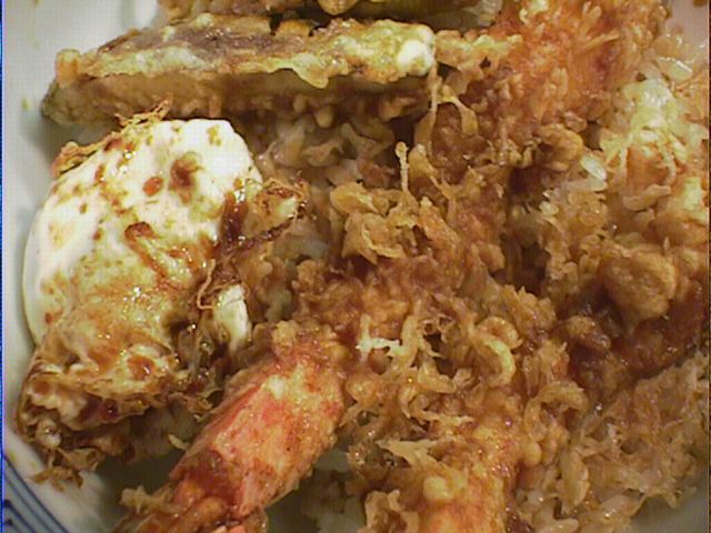 - 天丼の器、凄く大きいそうです。下の最初の写真で味噌汁の器と見比べてみるとわかりますね。器が大きいので、上にのっている天ぷらを他に移さないでも、最初からご飯が食べられるところがなかなかいいらしい。(び)