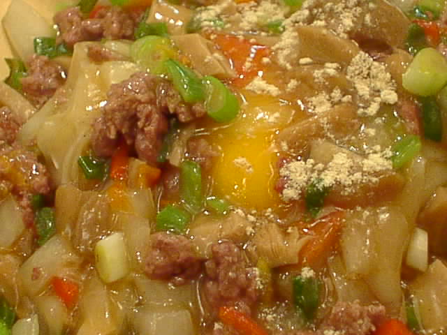 - 麺の上にユッケみたいな半生の肉と生卵がのっていて、それに熱くてとろみのあるタイ風のソースがかかっているという感じかな。熱いソースで半生の肉と生卵が丁度いい具合になっています。