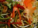- 春雨、玉子とじ、トマト、ピーマン、赤ピーマン、キュウリ。ミョウガみたいなのも入ってたけど、エシャロットかな。これかなり気に入りました。(び)