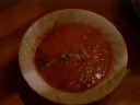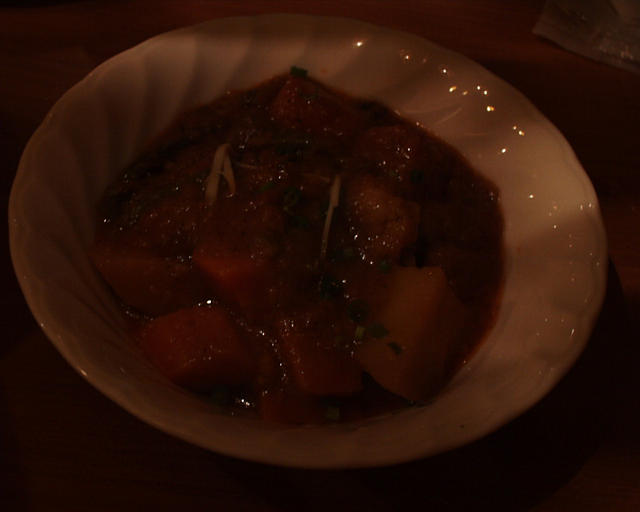 ごろんごろんとわりと大きな塊で羊子肉が入っています。見た目は濃い味っぽく見えますが、それほどではありません。(az)