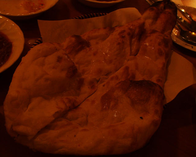 今日は私の所属する「パンの会」での友人がゲストってのもあって、小麦系の注文がすごい大量です。ここのナンは大好きなのですが、残る3人が米派で、ナンなどはそれほど食べないものですから、ほんの二切れほど残してしまい、私が持ち帰らせてもらいました。8等分してあれば、米派3人が各自1枚ずつ食べて、残りの5枚をパン好きの二人が片づけるのですから半端じゃないです。(笑)(az)