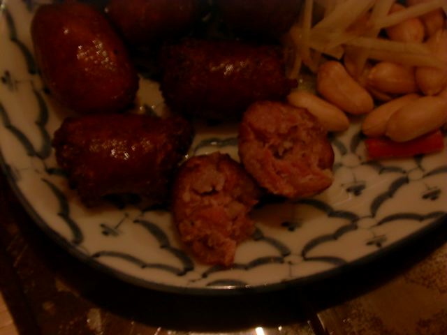 - コロッと小さく作ったソーセージを揚げたものですね。熱々で外がパリッとしててなかなかいいです。付け合わせのショウガやピーナツ、プリックと一緒に食べます。あ、これもメニューには800円とあるのに880円取られてますね。打ち間違いかなぁ。(め)