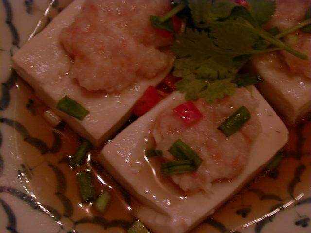 - ちょっと変わってるので注文してみました。皿が重なって出てくるのは、この料理がとても熱いからです。味のほうは見た目通りというか、絹ごしの豆腐にエビのすり身をのせて、ナムプラー風味のタレをかけて蒸し器で蒸したという味です。豆腐好きなので結構気に入りました。(め)