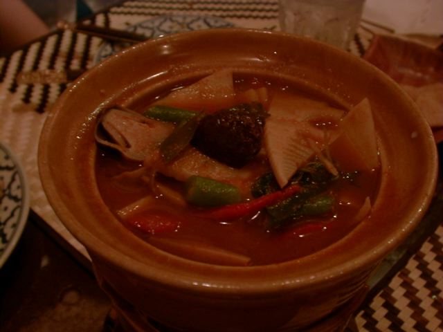 - メニューにはないんだけど、Kazeさんの希望で店の人にお願いしてみたら、作ってくれました。豚肉と魚の頭と作れるそうだけど、豚肉にしておきました。一人でかかえて食べたいというものじゃないけど、この独特の香りとサラサラした辛いスープがいいですよね。(め)