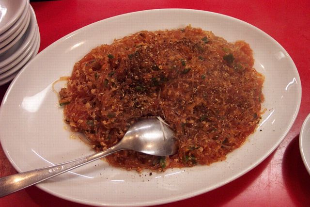 - 春雨、挽肉、葱をショウガと唐辛子などで炒め煮したものです。つるると辛みをまとわせて口にすべり入る春雨と肉の旨みをしっかりとじこめた挽肉のプリプリ感がいいです。料理に文句はありませんが、正直なところご飯にかけて食べたかった一品でした。(笑)客飯の時に是非試してみたいです。(az)