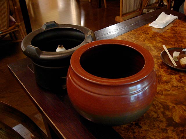茶盤の代わりが写真一枚目の陶器の壺みたいなの+茶壺下に置いてるお皿、ですね。(JK)