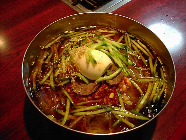 - この店は手打ち冷麺がおすすめ料理の一つになっています。押し出し式の製麺機なので糸コンニャクのような丸い断面の麺で、よく韓国料理屋で食べるハサミを使わないと切れないような冷麺とは違って、日本人好みの食べやすい麺です。麺もスープも美味しいのですが、具は肉がちょっと塩っぱかったり、スライスしたリンゴの芯の部分が口にあたったり、キュウリが季節外れだからかあまり美味しくなかったりでいまひとつかも。(め)