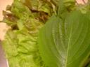 - サンチュと大葉にコチュジャンを塗り、そのなかに豚足とニンニク、青唐辛子を巻いて食べます。とっても美味しい。(い)
