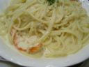 - ペペロンチーニ風のスパゲティに、わりと大きめの海老が12尾と春キャベツが入ったものを想像してもらえばいいかな。